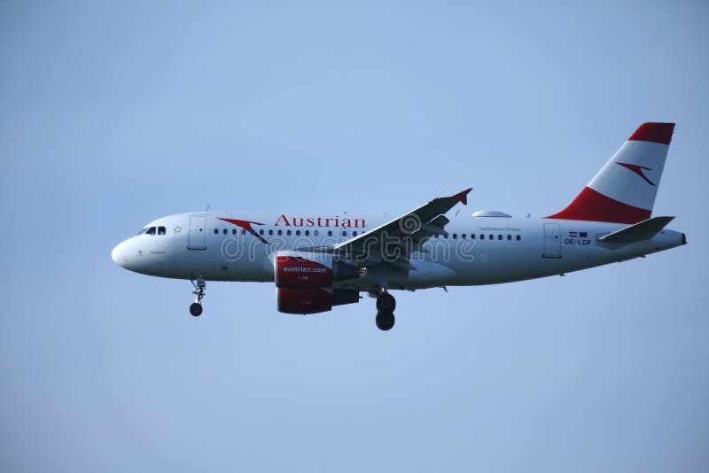 Austrian Airlines spiana nel cielo, atterrante. Austrian Airlines spiana la volata su nel cielo, fondo del cielo blu Aerei di Airbus
