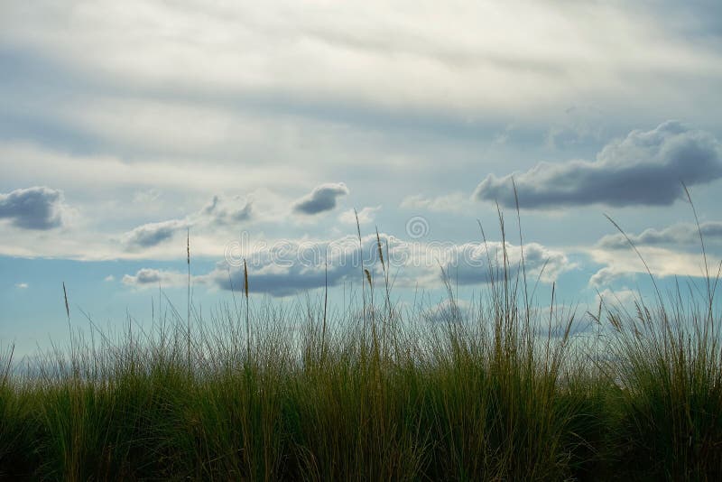 Erba e nuvole da sogno. Erba da sogno sullo sfondo di un cielo azzurro con nuvole grigie e bianche, scattata nel delta del Botswana, Africa