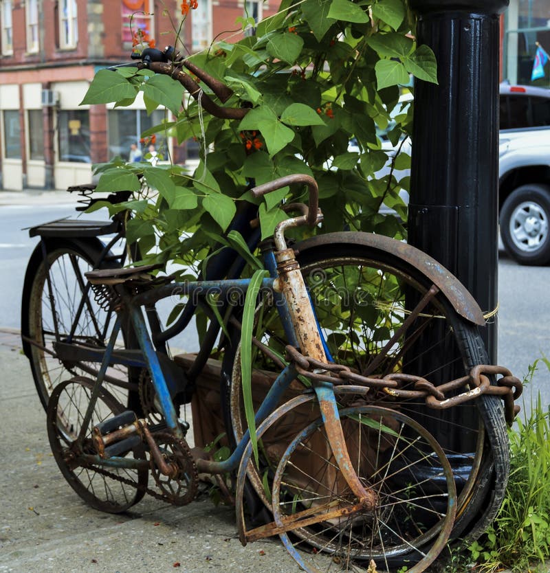 Vecchie biciclette dimenticate incatenate. Biciclette retrò arrugginite per adulti e bambini sono incatenate attorno a un lampione su un marciapiede a Belfast, Maine. Viti rampicanti crescono intorno a loro.