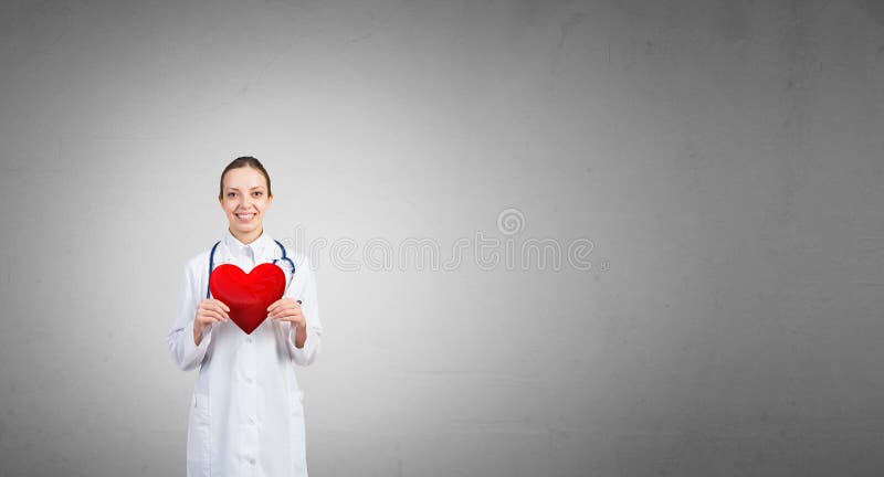 Controlla il tuo cuore. Giovane dottoressa su sfondo grigio che tiene un cuore rosso