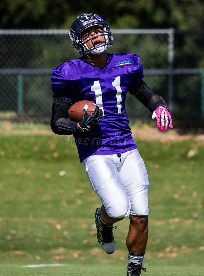 Ampio ricevitore. Azione di calcio all'all-star game del ` s del leone in Redding, California