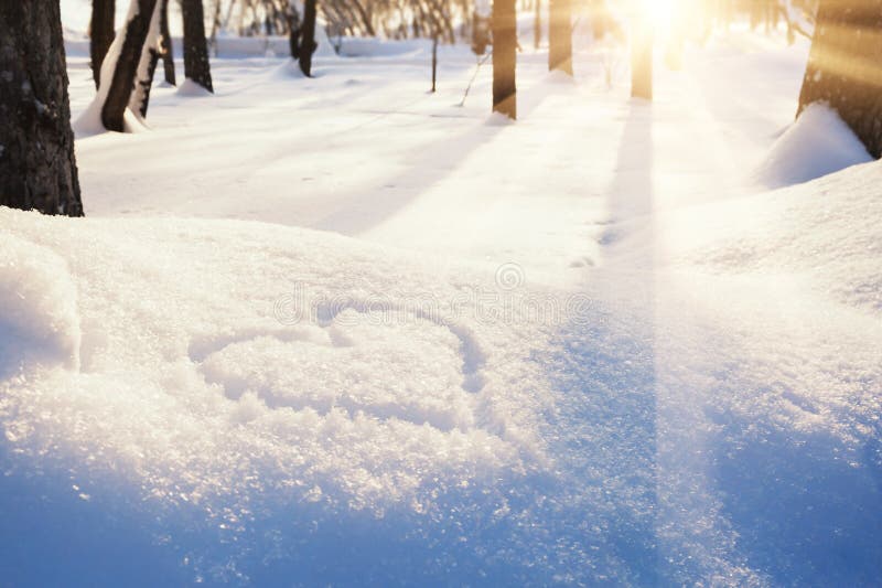 Forma di cuore sulla neve Foresta di inverno a luce solare di sera
