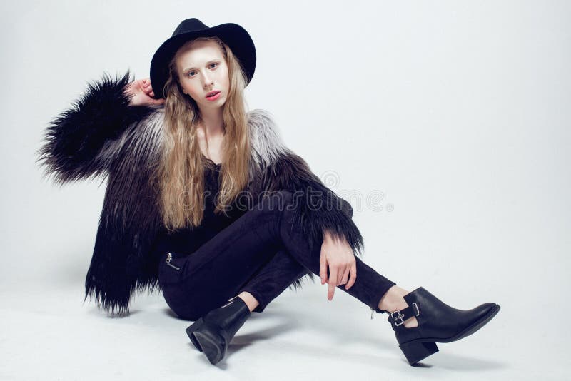 Giovane ragazza bionda adolescente con cappello e cappotto di pelliccia, modella snella e alla moda, scatto in studio