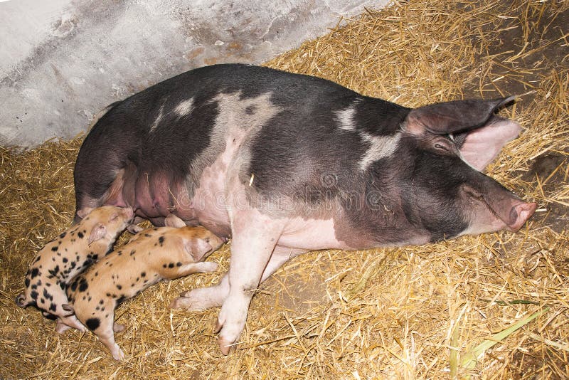 Maiale di razza danese con maialini. Scrofa danese con due porcellini macchiati che allattano