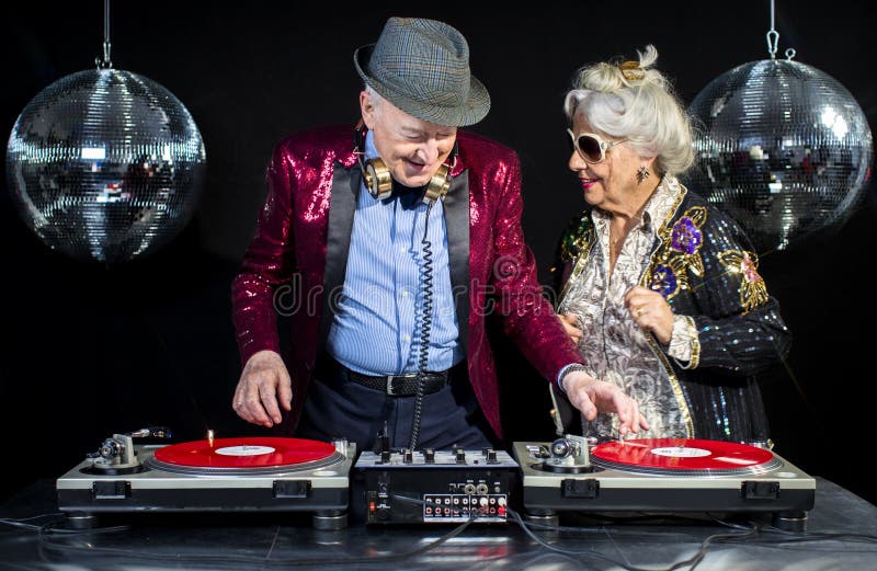Nonna e nonno DJ. Una nonna e un nonno fantastici, una coppia di anziani che fanno il DJ e si divertono in una discoteca