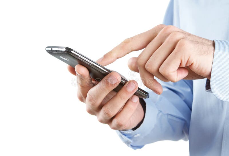 Utilizzo di uno smartphone. Primo piano di un uomo che usa uno smartphone isolato su sfondo bianco