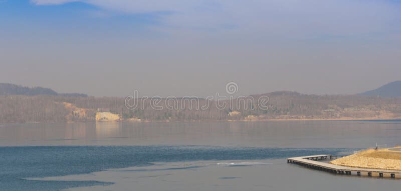 Il lago Berzdorfer, il lago Berzdorfer nella Germania orientale in condizioni di nebbia con un sottile strato di ghiaccio sulla superficie dell'acqua.