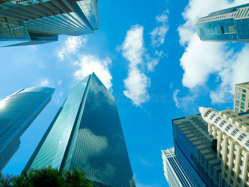 Architettura eclettica. Grattacieli nel quartiere finanziario di una città, di vari stili e generi architettonici, visti sotto un cielo azzurro con qualche nuvola sparsa