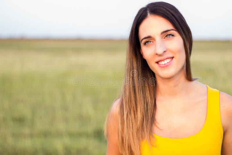 Ritratto di una bellissima donna in un prato. Guarda altrove e sorride